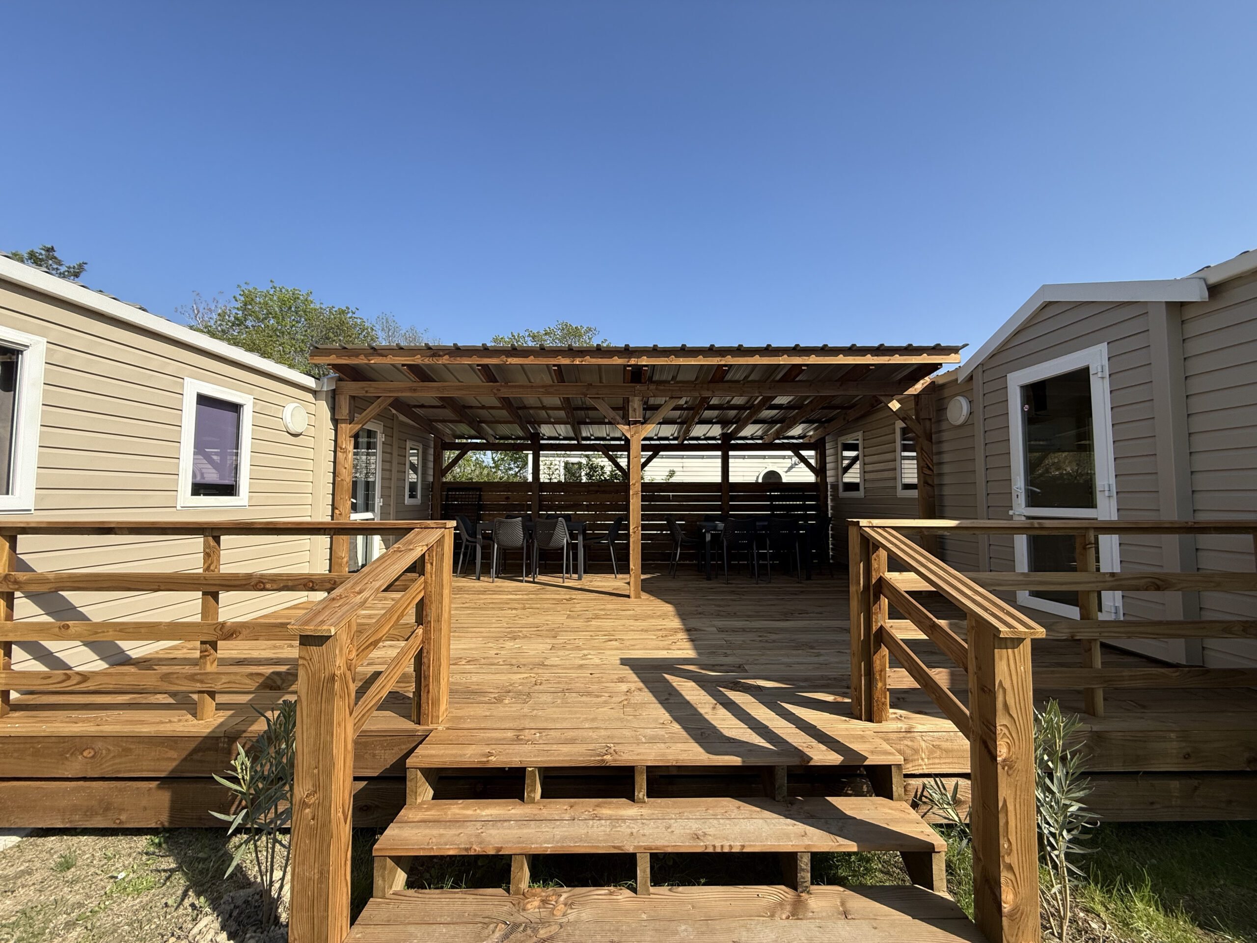 Les emplacements avec tonnelle ont eux aussi une superficie comprise entre 80 et 100 m2. La superficie de l’espace sous tonnelle est quant à elle de 10 m2. L’abri est suffisamment spacieux pour accueillir une tente, un salon de jardin et des chaises longues. Il est possible en tout cas de faire de la tonnelle une terrasse privative ou même une extension de l’intérieur de la caravane.